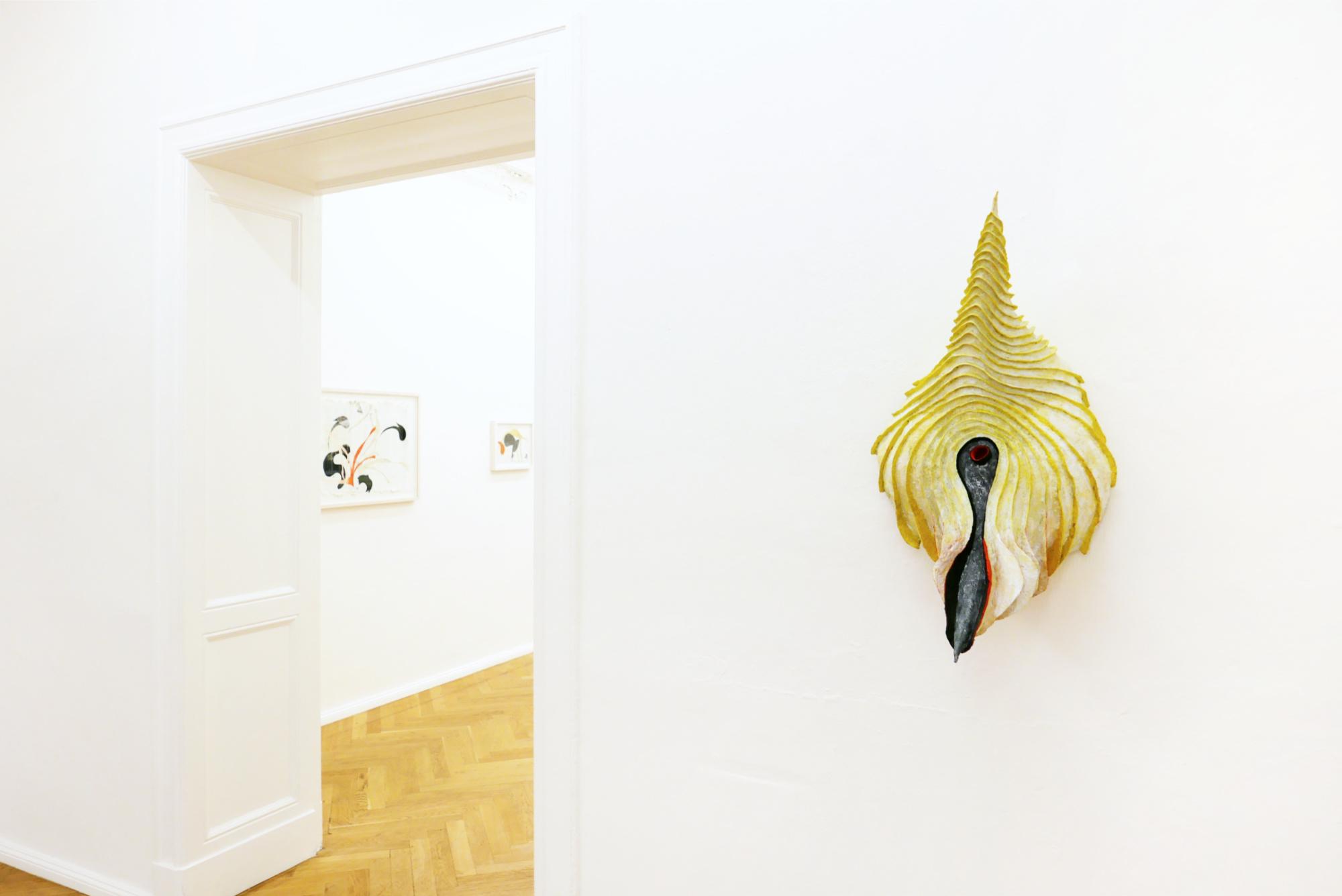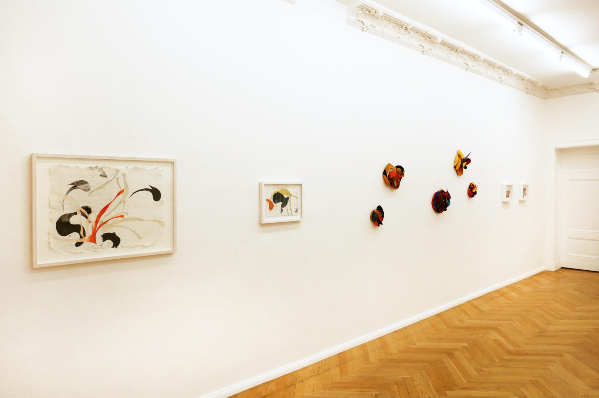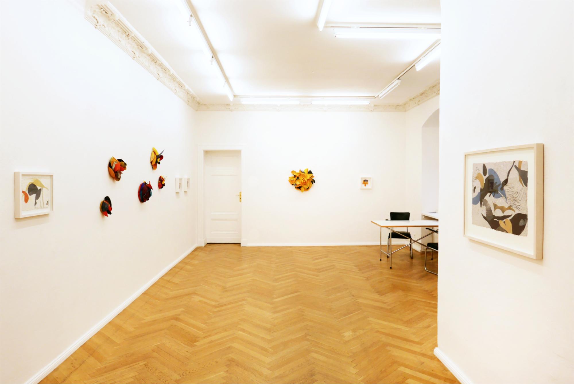 The forms and colours of Alexandra Deutsch’s fragile paper objects and monotypes derive from organic and inorganic worlds, reminding us of exotic plants, fossils or rock formations. They are inspired by stays in the Mauritanian desert, yet they are abstract, speaking a formal language of their own. Objects of expansive plasticity grow along the walls. Their surfaces are structured by slats or folds; tentacles and l ines extend into space. Painted with weakly bound pigments, they have a strongly luminous colorfulness and allow you to immerse yourself in a faraway world.