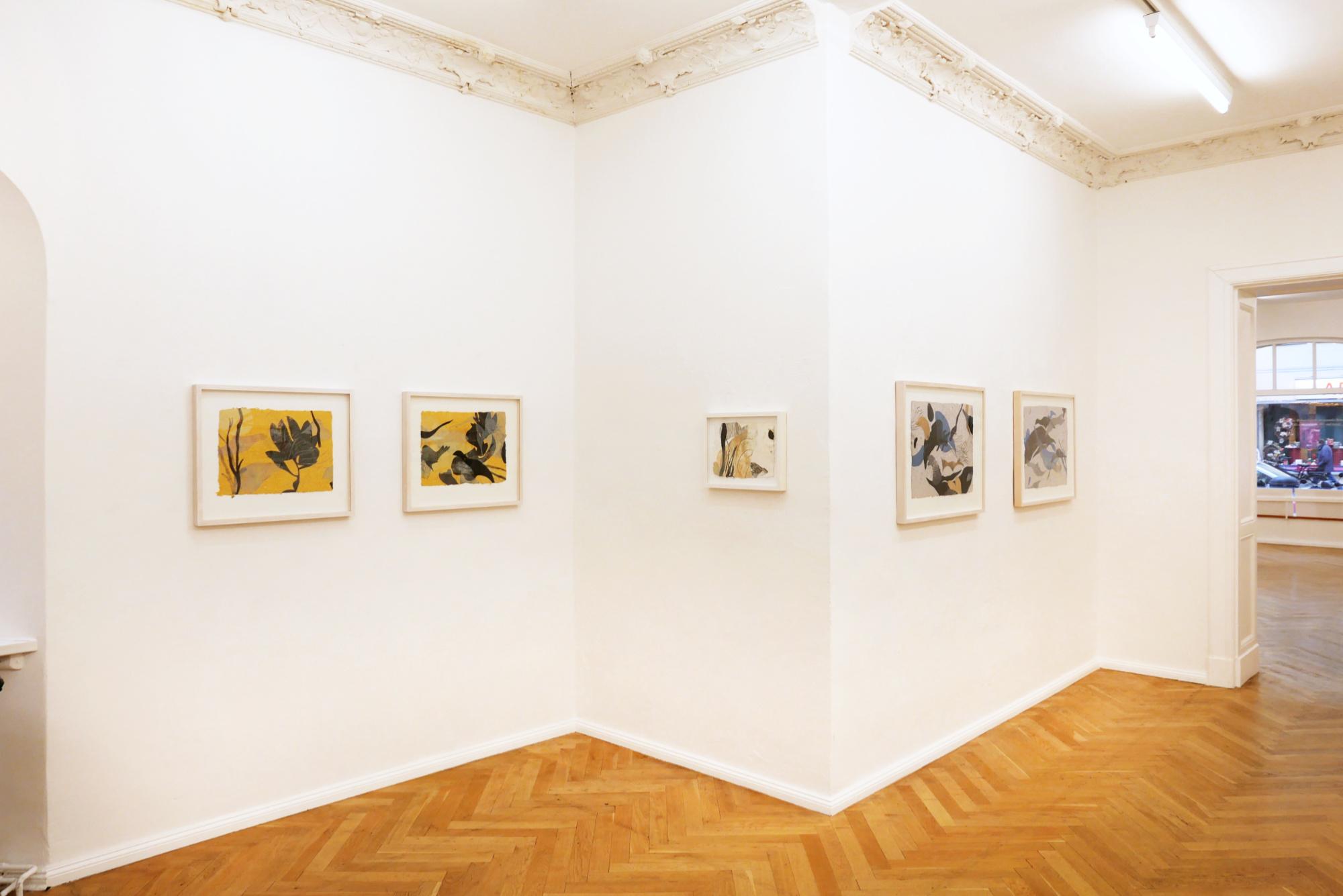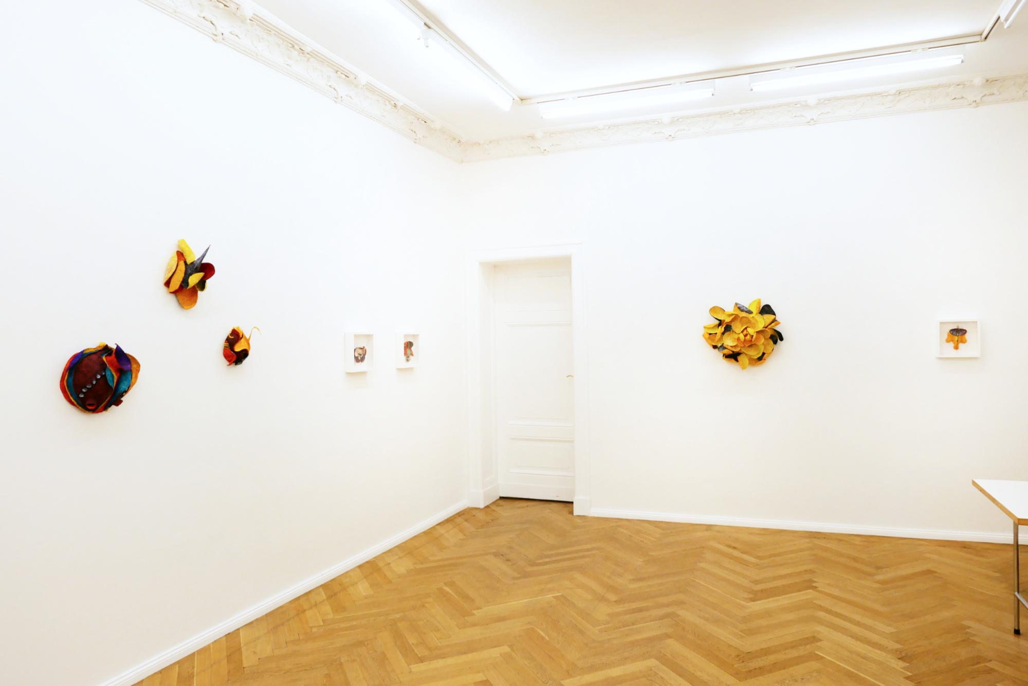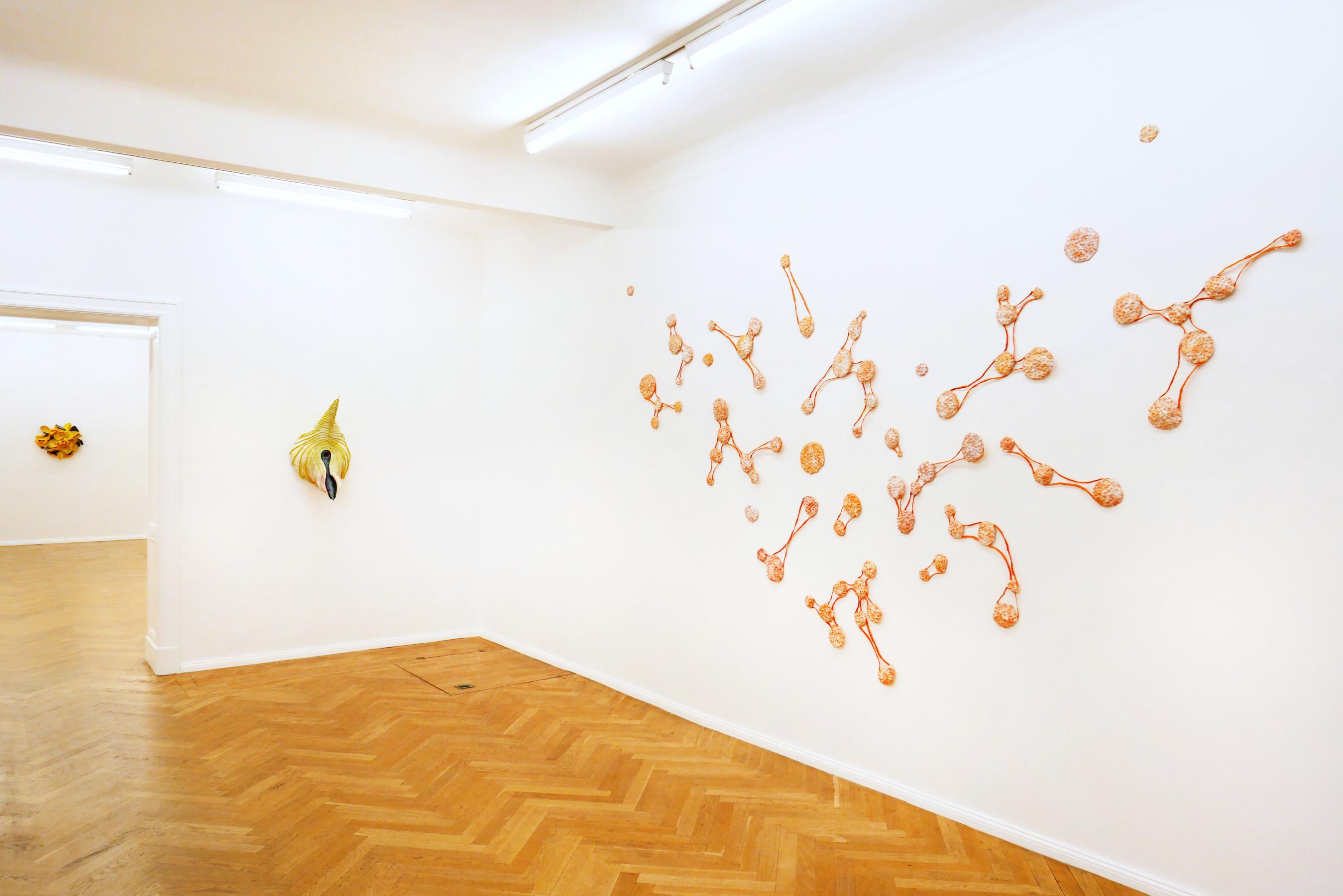 The forms and colours of Alexandra Deutsch’s fragile paper objects and monotypes derive from organic and inorganic worlds, reminding us of exotic plants, fossils or rock formations. They are inspired by stays in the Mauritanian desert, yet they are abstract, speaking a formal language of their own. Objects of expansive plasticity grow along the walls. Their surfaces are structured by slats or folds; tentacles and l ines extend into space. Painted with weakly bound pigments, they have a strongly luminous colorfulness and allow you to immerse yourself in a faraway world.