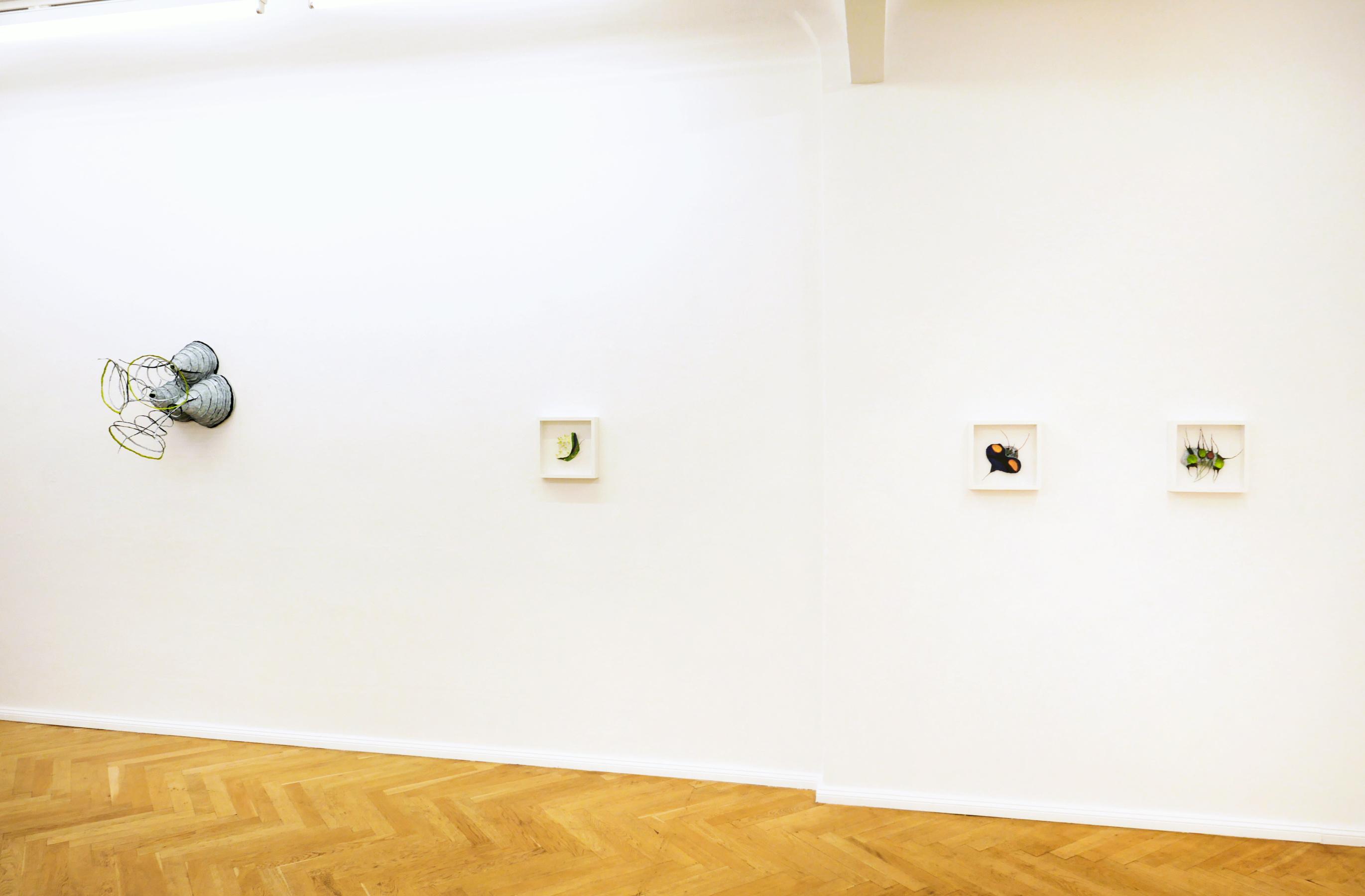 Formen und Farbigkeit der fragilen Papierobjekte von Alexandra Deutsch wie auch ihrer Monotypien entstammen organischen und anorganischen Welten, erinnern an exotische Pflanzen, Fossilien oder Gesteinsformationen. Inspiriert sind sie von Aufenthalten in der Mauretanischen Wüste und sind doch abstrakt, sprechen eine eigene Formensprache. Objekte von raumgreifender Plastizität wachsen an den Wänden entlang. Ihre Oberflächen sind durch Lamellen oder Faltungen strukturiert,Tentakeln und Linien dehnen sich in den Raum aus. Mit schwach gebundenen Pigmenten bemalt, haben sie eine stark leuchtende Farbigkeit und lassen einen Eintauchen in eine ferne Welt.